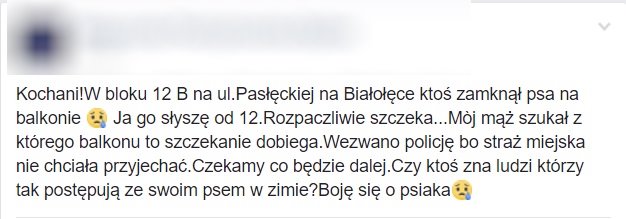 „Kochani! W bloku 12 B na ul.Pasłęckiej na Białołęce ktoś zamknął psa na balkonie. Ja go słyszę od 12.Rozpaczliwie szczeka…Mój mąż szukał z którego balkonu to szczekanie dobiega.Wezwano policję bo straż miejska nie chciała przyjechać.Czekamy co będzie dalej.Czy ktoś zna ludzi którzy tak postępują ze swoim psem w zimie?Boję się o psiaka.  – brzmiał apel na Facebooku opublikowany wczorajszego popołudnia.