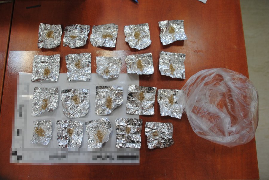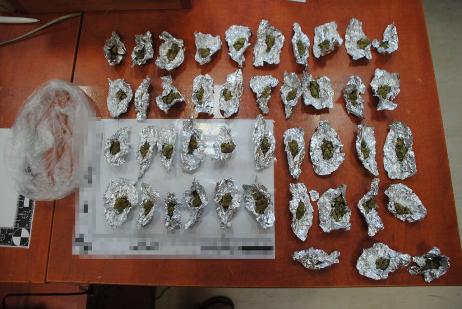 W trakcie szczegółowego przeszukania policjanci znaleźli na szafce kuchennej dwa zawiniątka zawierające susz roślinny oraz wagę elektroniczną. W pozostałych pomieszczeniach funkcjonariusze ujawnili kolejne 43 zawiniątka z zawartością suszu roślinnego, 20 zawiniątek zawierających beżowy proszek oraz 11 zawiniątek z białą substancją.