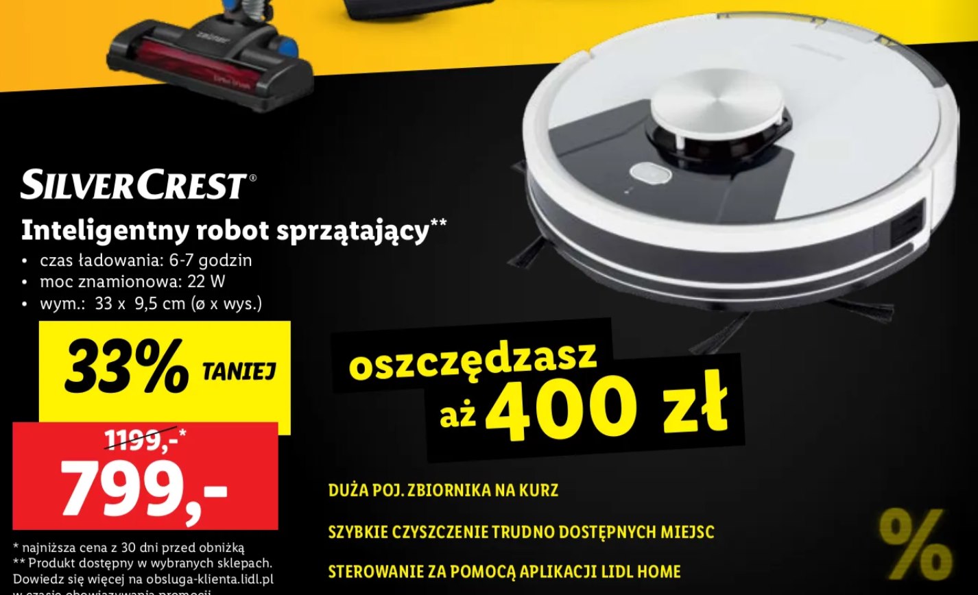 Oferta Lidla na Black Friday prezentuje atrakcyjne zniżki na wiele produktów, w tym na inteligentne roboty sprzątające. Robot marki SilverCrest, dostępny w wybranych sklepach, jest teraz oferowany z imponującym 33 proc. rabatem, co pozwala zaoszczędzić aż 400 złotych. Początkowa cena 1199 zł została obniżona do 799 zł.