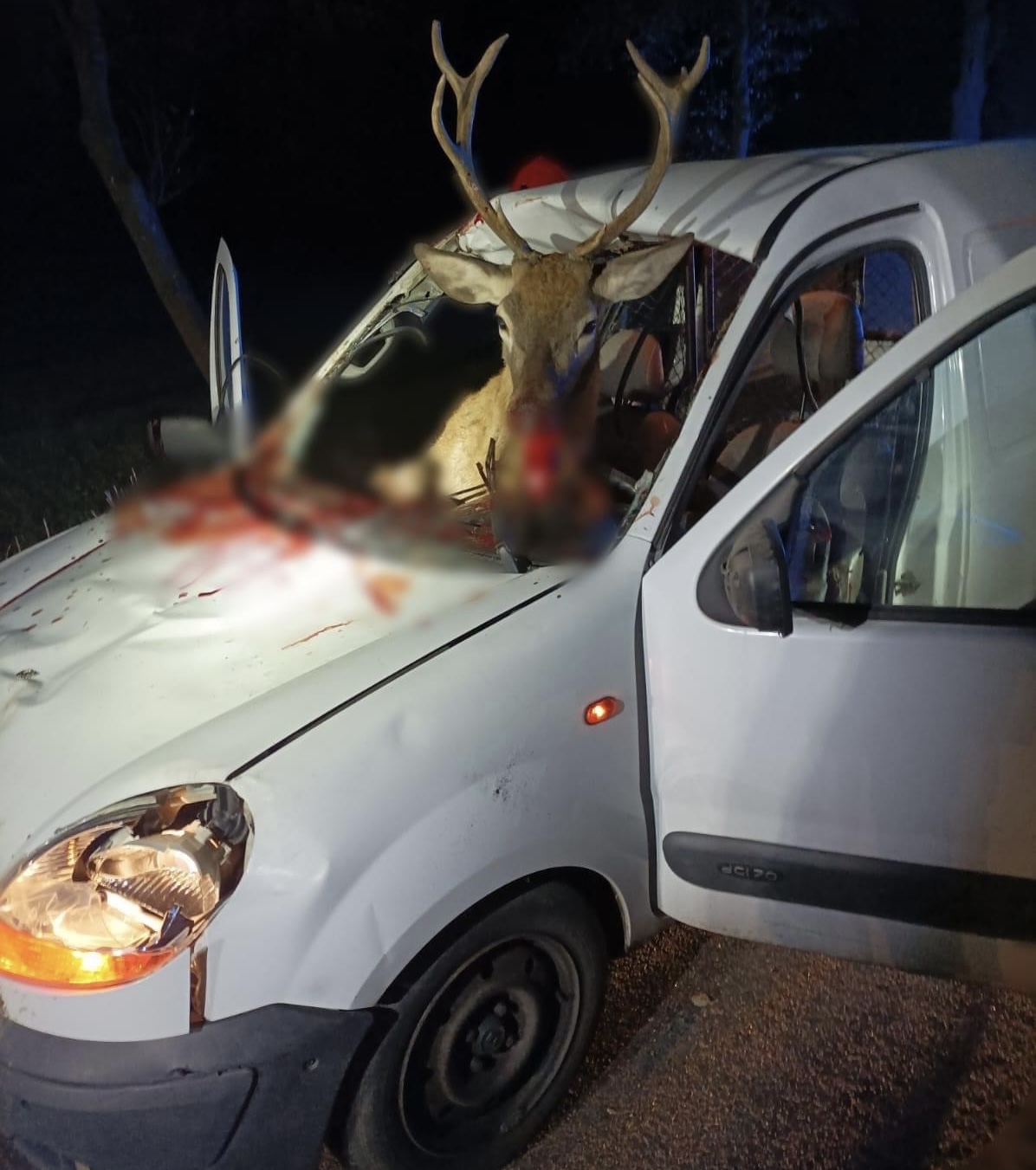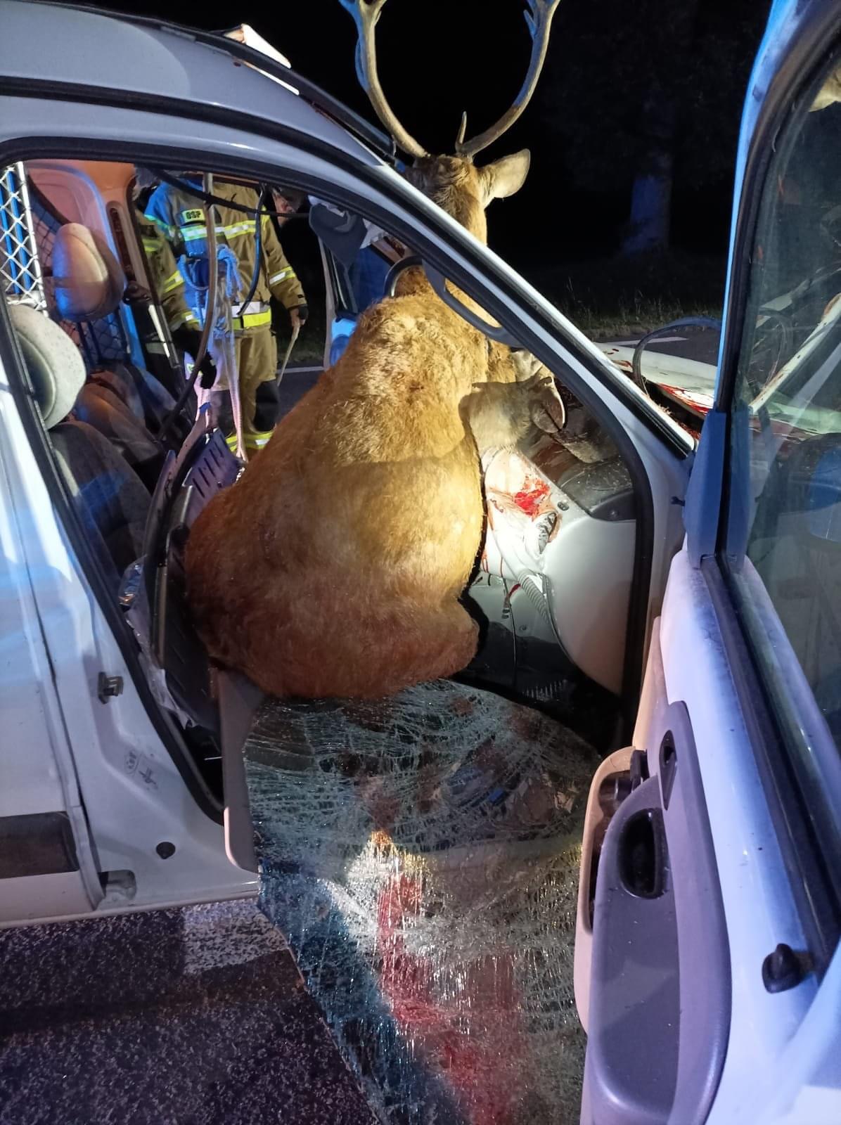 Potrącenie jelenia przez samochód osobowy. Żywe zwierzę z pojazdu uwolnili strażacy