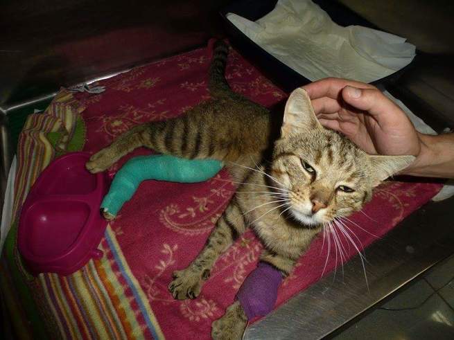 Zabieg zespojenia kości przeprowadził lekarz ortopeda. Na nogę założono opatrunek usztywniający. Kocurek trafił do klatki na szpitaliku. Niestety, tego typu urazy goją się bardzo długo, a proces regeneracji trwa tygodniami. Lekarze ocenili czas potrzebny na pełen zrost kości na 8 do 12 tygodni. Przez ten czas kot nie może opuszczać klatki, ponieważ mógłby uszkodzić sobie nogę i zniweczyć pracę lekarza chirurga.
