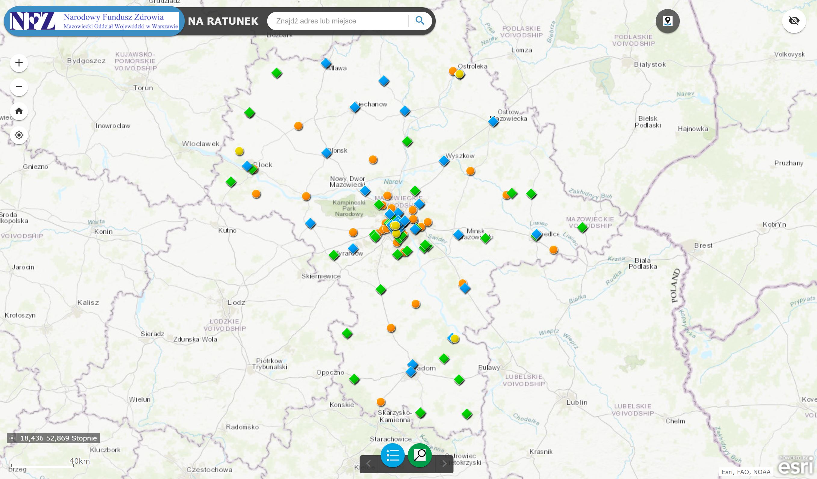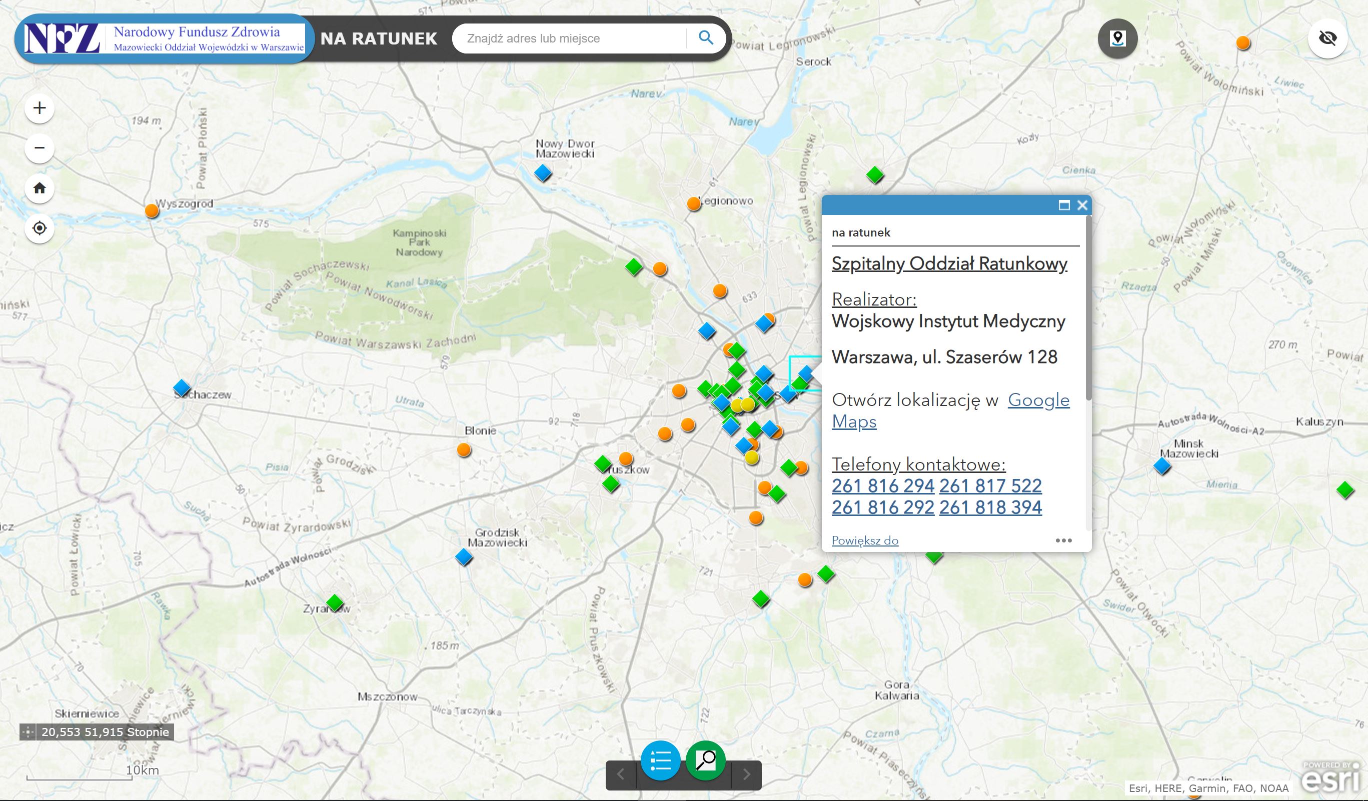 W sierpniu 2019 r. mazowiecki oddział NFZ udostępnił mapę i aplikację web „NA RATUNEK MAZOWSZE”, która ułatwia znalezienie placówek świadczących pomoc w nagłych wypadkach. W ślad za tym pilotażowym projektem mają iść kolejne, które ułatwią pacjentom dostęp do świadczeń medycznych na terenie Mazowsza. Aplikacje i cyfrowe mapy udostępnione pacjentom wykorzystują m.in. oprogramowanie do analiz przestrzennych ArcGIS od Esri.