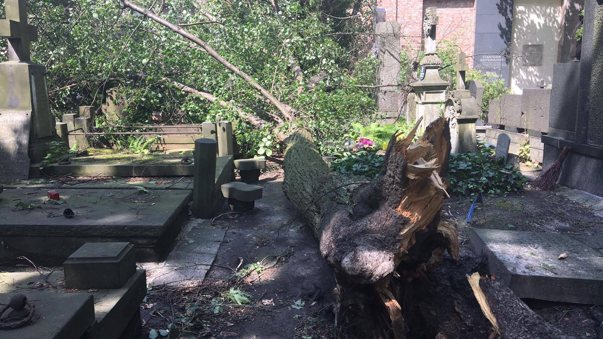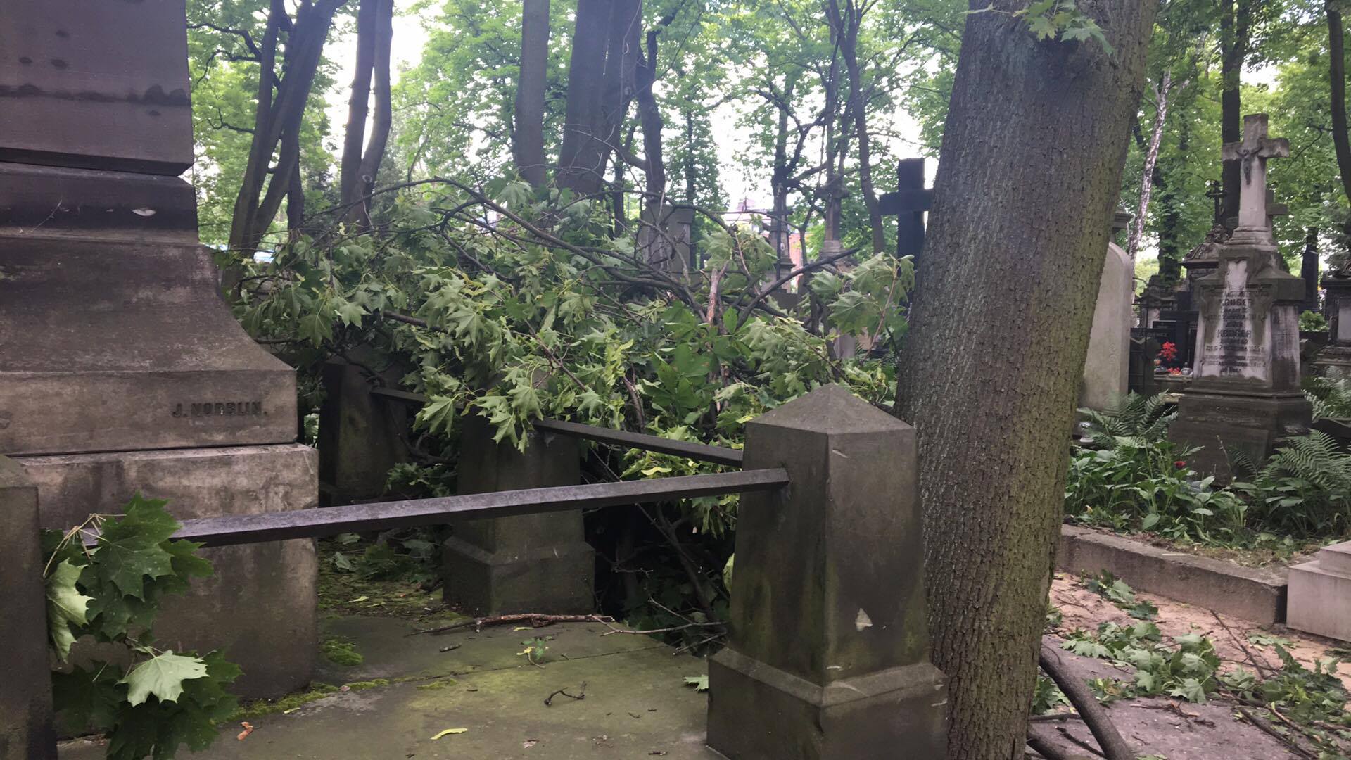Powązki: niebezpiecznie na cmentarzu! Ostrzeżenie przed spadającymi konarami. Zniszczone nagrobki będą odbudowywały rodziny
