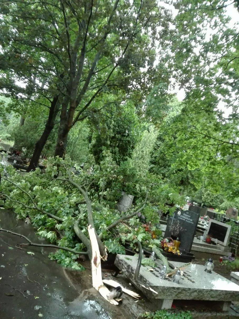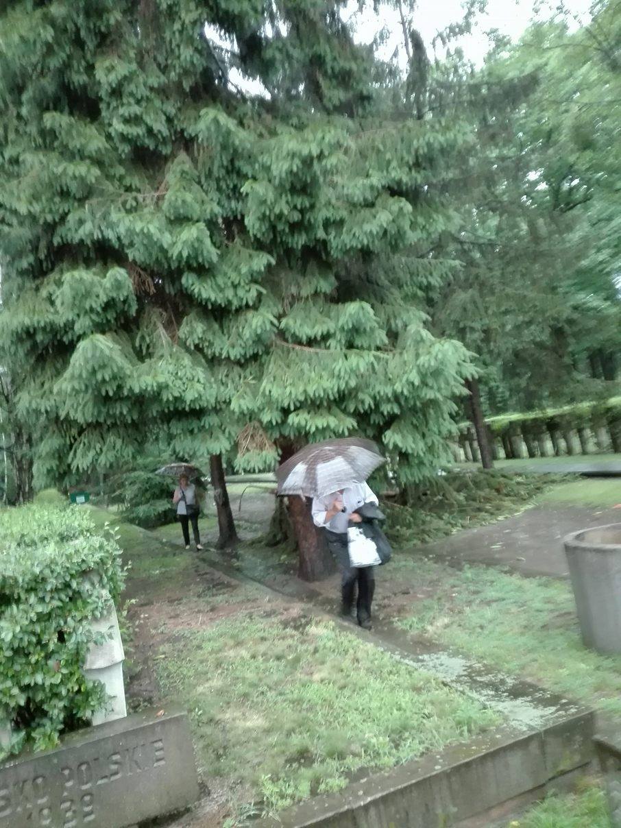Żałobników na Cmentarzu Wojskowym na Powązkach zaskoczyła burza. Ulewa i błyskawice uwięziły ludzi na cmentarzu. Alejki i groby zostały przywalone przez drzewa.