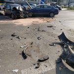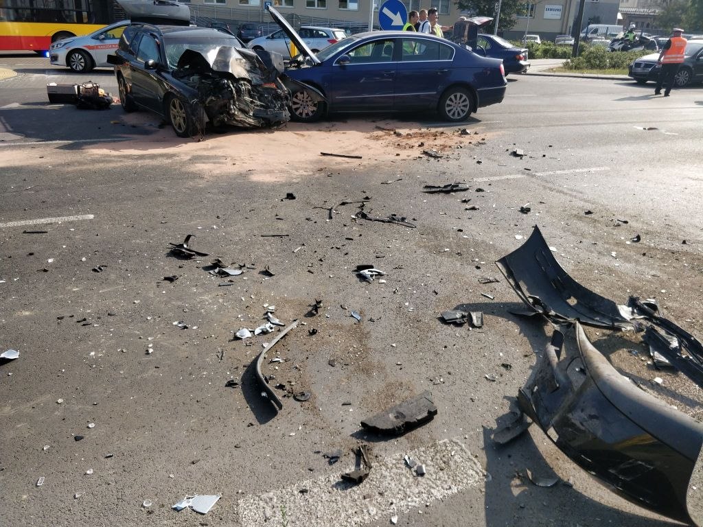 Ulica Jagiellońska w kierunku Białołęki jest całkowicie zablokowana. Części aut leżą na całej szerokości jezdni.