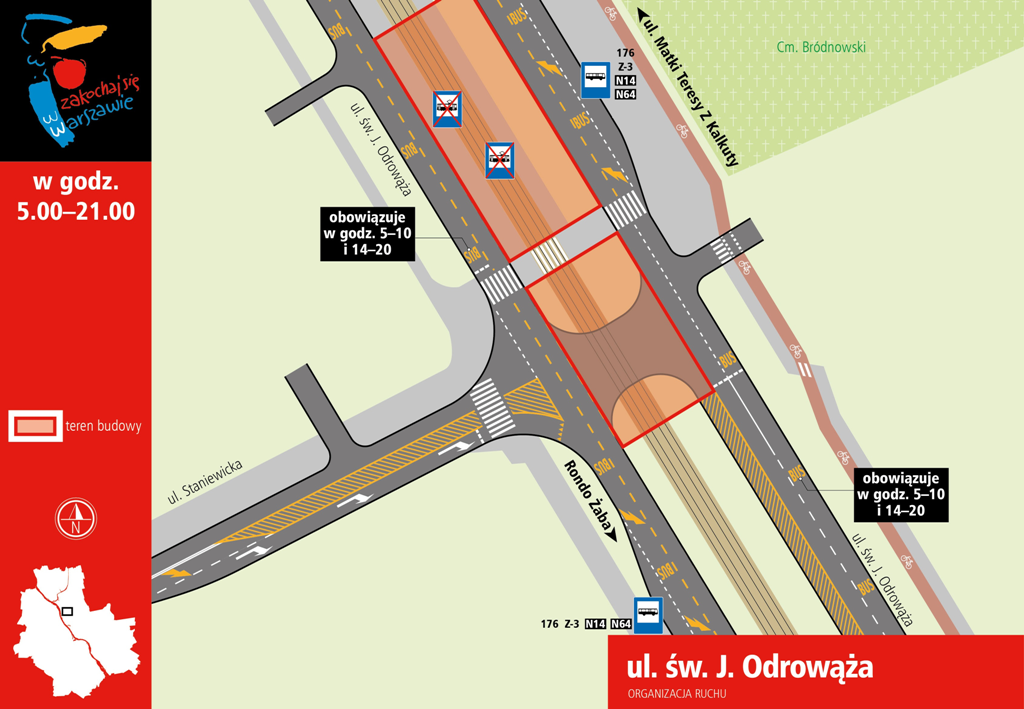 Organizacja ruchu na ul. św. J. Odrowąża w godz. 5.00-21.00. Fot. UM Warszawa