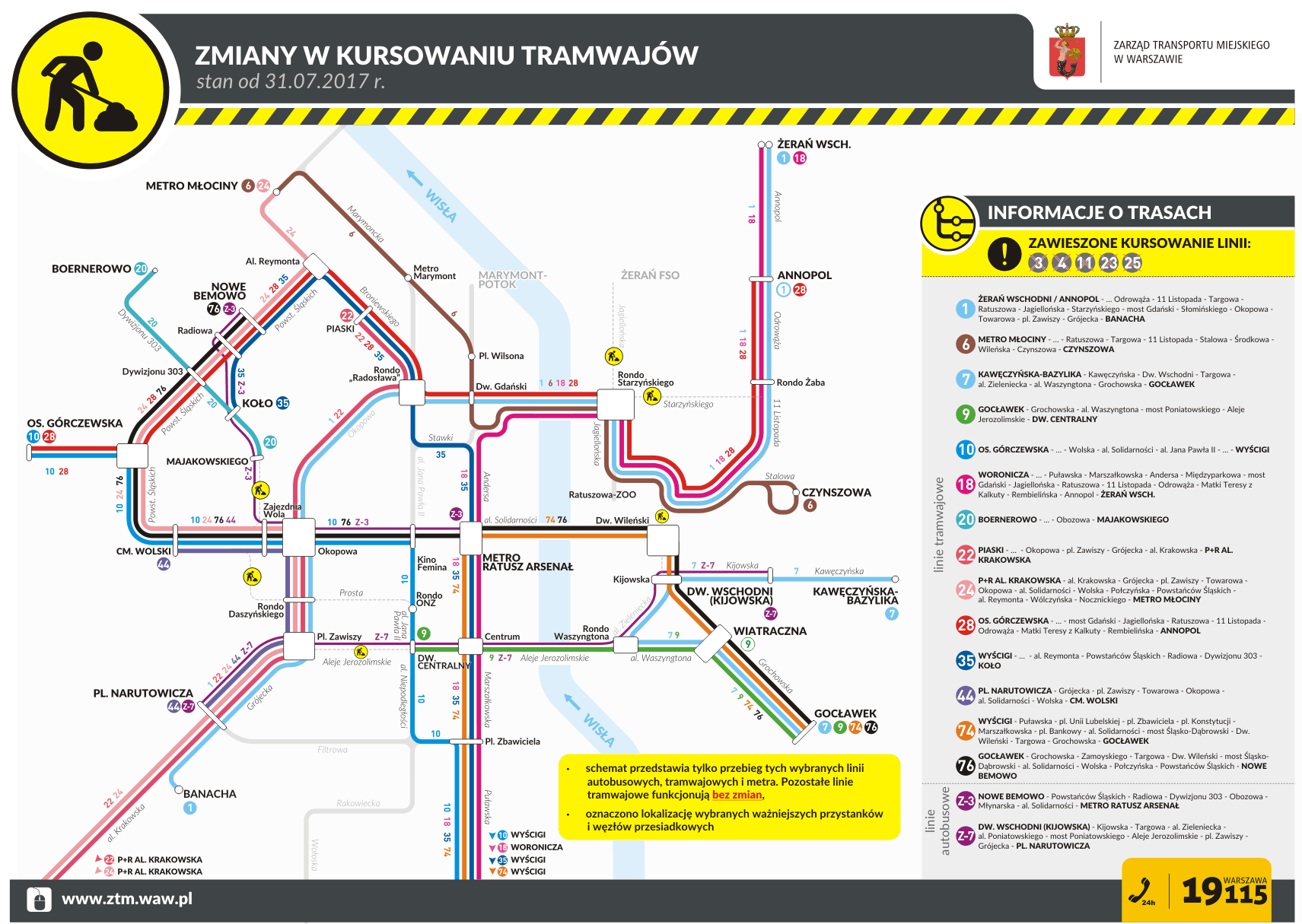W niedzielę, 30 lipca tramwaje wróciły w al. „Solidarności” i na ul. Targową do Kijowskiej. Tego samego dnia przestały kursować w ciągu ul. Jagiellońskiej od Ronda S. Starzyńskiego do pętli ŻERAŃ FSO oraz w ciągu ul. S. Starzyńskiego od Ronda S. Starzyńskiego do ronda Żaba. Od poniedziałku, 31 lipca wyłączony będzie ruch tramwajów w Al. Jerozolimskich na odcinku od przystanku Dw. Centralny do pl. A. Zawiszy.