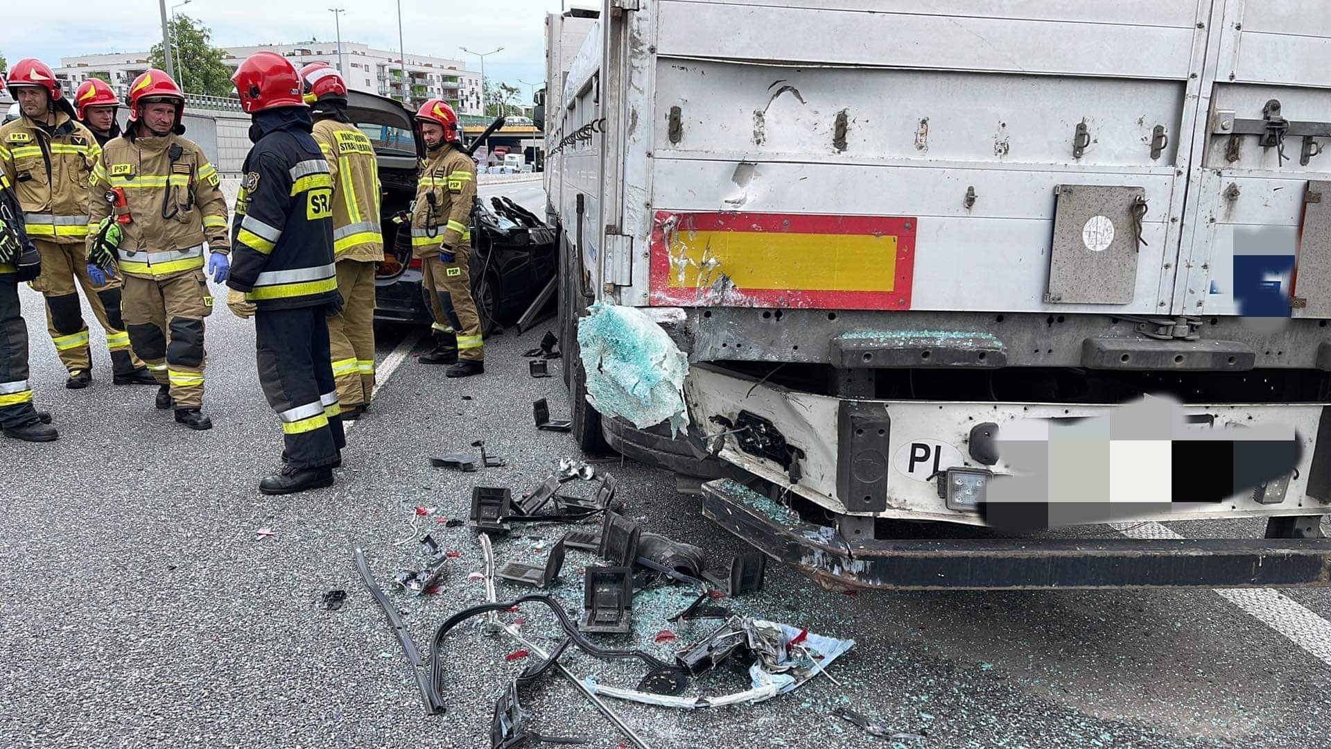 Na trasie S8 na wysokości Lazurowej w kierunku Marek doszło do poważnego wypadku. Kierujący samochodem osobowym marki BMW wbił się pod ciężarówkę. Mężczyzna trafił do szpitala.