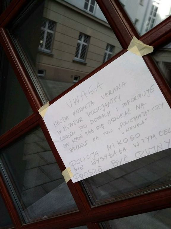 Kobieta chodzi ponoć po domach i ostrzega przed… oszustwami „na wnuczka” i „policjanta”. Ktoś dał się podobno oszukać na 25 tys. zł.