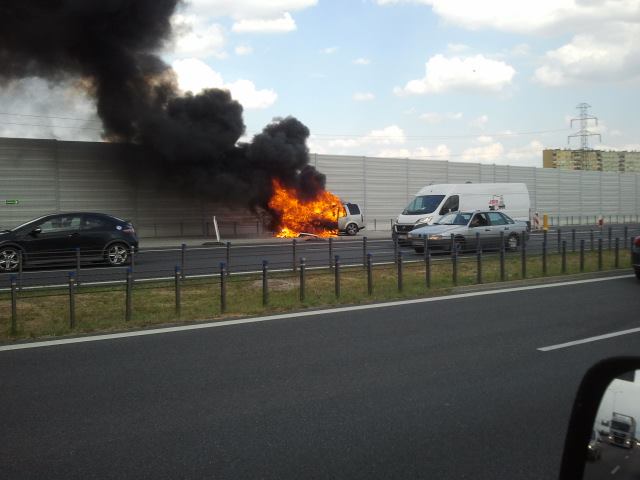 Uważajcie w tamtym rejonie. Pożar samochodu generuje duże zadymienie, dodatkowo kierowcy zwalniają, by sprawdzić co się dzieje.
