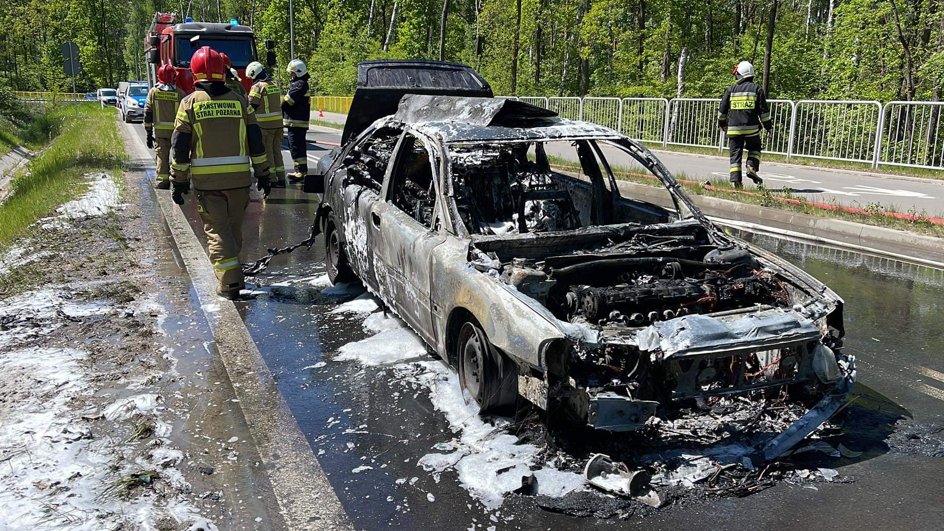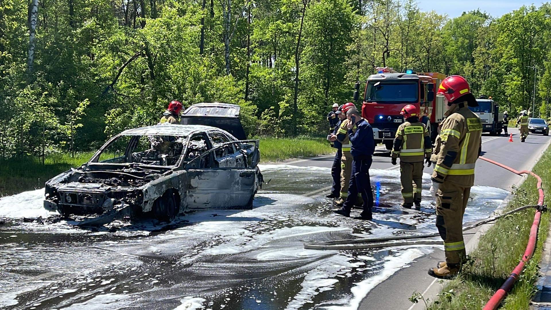 Pożar samochodu osobowego. Droga zablokowana