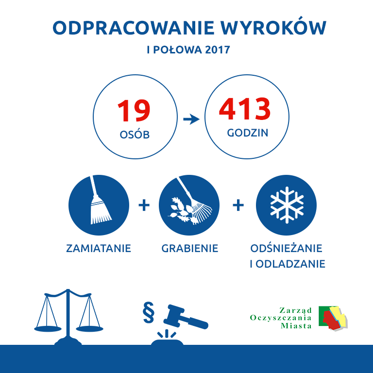 W pierwszym półroczu 2017 r. do odpracowania wyroku zgłosiło się 31 osób, z czego faktycznie podjęło pracę 19 skazanych, którzy przepracowali 413 godzin. W 2016 roku 73 osoby porządkowały miasto przez 1387 godziny.