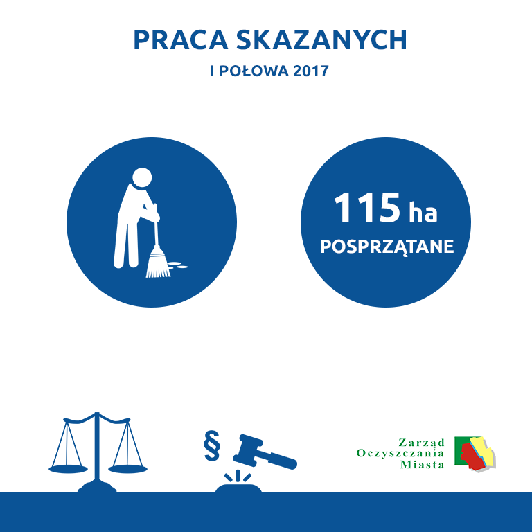 Skazani pracują średnio 30 godzin miesięcznie. Najwyższy wymiar kary w 2016 r. wynosił 12 miesięcy pracy po 40 godzin. Na rzecz czystości miasta przez 15 lat pracowali także osadzeni z Zakładu Karnego Warszawa-Białołęka. Myli kosze na śmieci, usuwali nielegalnie naklejone plakaty i sprzątali ciągi piesze. Przez 6 miesięcy tego roku oczyścili ponad 115 ha terenów dla pieszych.