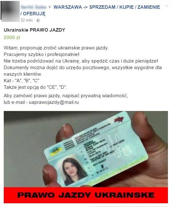 Wczoraj dostaliśmy screen z warszawskiej grupy sprzedażowej, gdzie sprzedający oferuje prawo jazdy z Ukrainy. Nie trzeba nawet jeździć na wschód, dokumenty otrzymujemy… pocztą. Ludzie nie róbcie tego! Mało jest wypadków w Warszawie? Można zrobić krzywdę sobie i komuś. Egzaminy są po coś. Jasne, że trzeba iść na kurs, a egzaminatorzy oblewają za byle co. Ja 16 lat temu nie zdałam, bo nie sprawdziłam lusterek… Zdarza się, ale pomyślcie, o innych. Bez umiejętności narażacie niewinne osoby. Biznes kwitnie bo są chętni. Smutna prawda. Apelujemy bojkotujcie to!