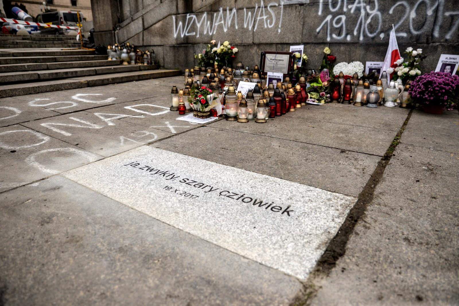 Na tablicy wyryte jest zdanie: „Ja zwykły Szary Człowiek. 19 października 2017”.