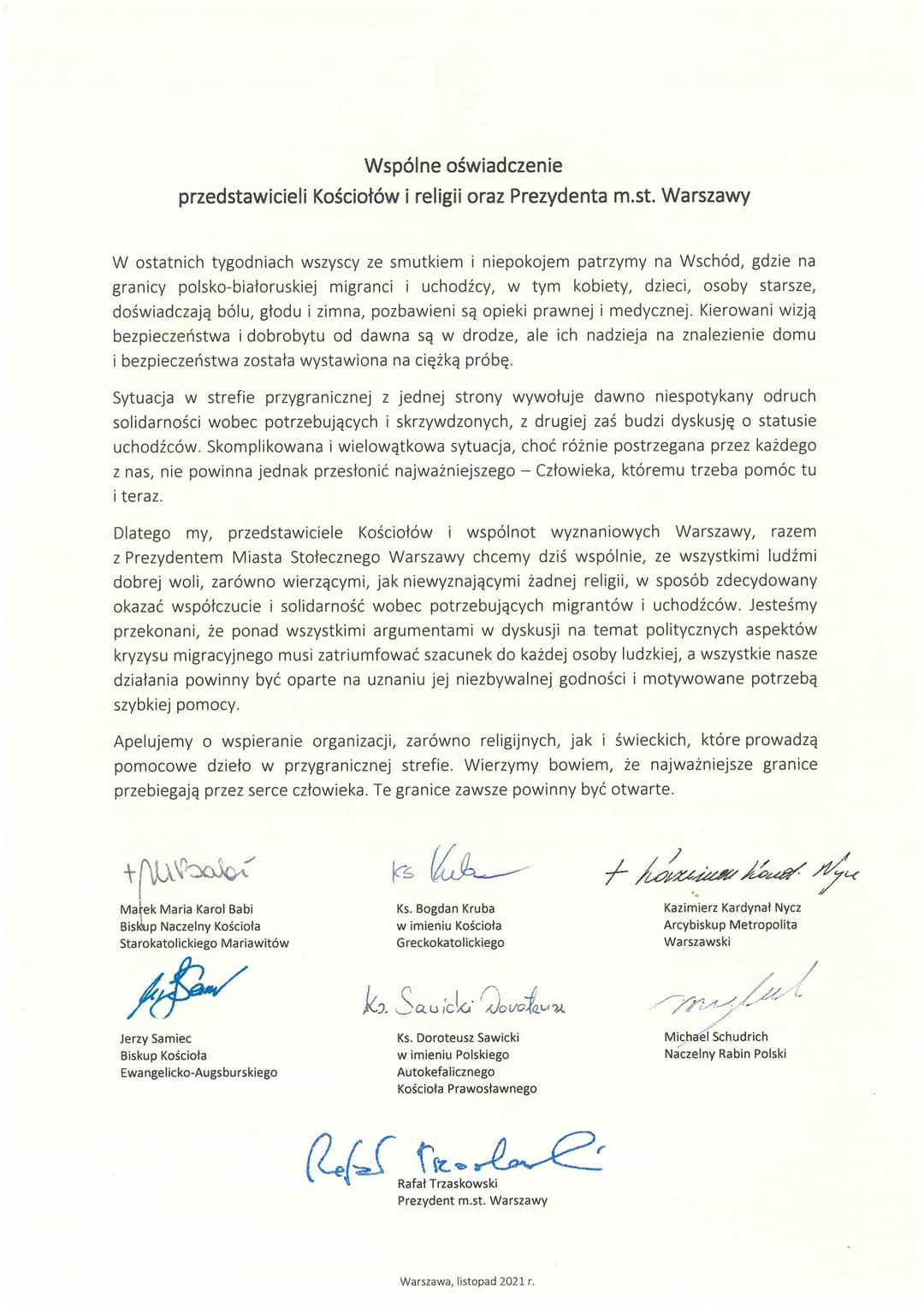 „Sytuacja na granicy polsko-białoruskiej jest trudna i złożona. To poważne wyzwanie dla naszego państwa i zaangażowanych służb, ale też ważna lekcja człowieczeństwa dla nas wszystkich. Razem z przedstawicielami kościołów i religii podpisałem apel o wsparcie dla potrzebujących.” – napisał prezydent Warszawy Rafał Trzaskowski na Facebooku.