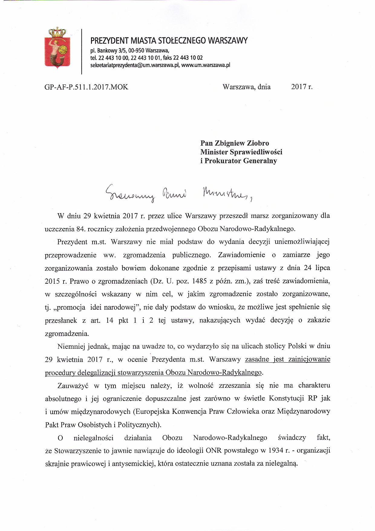 Hanna Gronkiewicz-Waltz, Prezydent Warszawy zapowiedziała, że napisze do Zbigniewa Ziobry, Ministra Sprawiedliwości ws. delegalizacji ONR. Zgodnie z zapowiedziami, pismo takie wysłano w piątek po południu. Co się w nim znajduje?