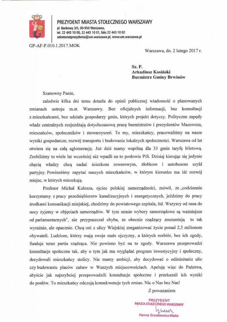 „Prawo i Sprawiedliwość deklarowało w kampanii, że będzie „słuchać obywateli” – tymczasem zmiany w ustroju #Warszawa są nie tylko sprzeczne z interesami mieszkańców stolicy i okolicznych gmin, ale też mają być wprowadzane bez jakichkolwiek konsultacji z nimi” – pisze Hanna Gronkiewicz-Waltz – „Skoro PiS znów stosuje fortel z projektem poselskim, aby uniknąć rozmowy z obywatelami – sami przeprowadzimy konsultacje, a ich efekty dostarczymy posłom partii rządzącej. Wystosowałam w tej sprawie list do burmistrzów wszystkich podwarszawskich gmin, których dotyczy projekt ustawy. Nic o nas bez nas!” – dodaje.