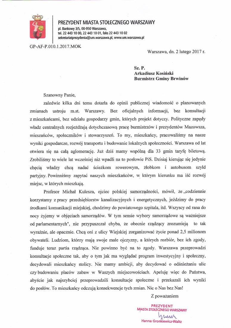 Hanna Gronkiewicz-Waltz opublikowała właśnie treść pisma, jakie ma zamiar wysłać do burmistrzów okolicznych miejscowości. Apeluje w nim, żeby przeprowadzić konsultacje społeczne, a wyniki przekazać partii rządzącej.