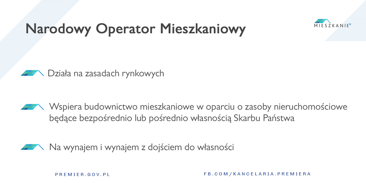 Narodowy Fundusz Mieszkaniowy zostanie powołany ustawą. Będzie swoistym bankiem ziemi, która będzie wykorzystywana w realizacji budownictwa mieszkaniowego. Operacyjne prowadzenie inwestycji oraz zarzadzanie wybudowanym zasobem będzie zadaniem Narodowego Operatora Mieszkaniowego.