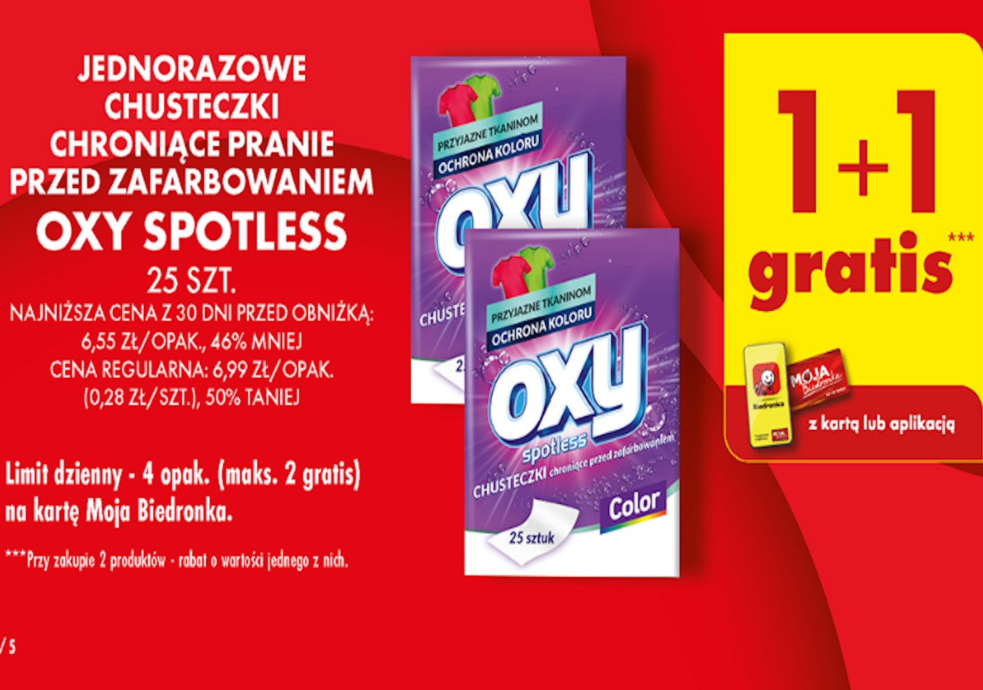 W dniu 27 listopada 2023 roku sieć sklepów Biedronka oferuje swoim klientom atrakcyjną promocję na jednorazowe chusteczki do prania marki OXY Spotless. Produkt ten ma za zadanie chronić pranie przed zabrudzeniem kolorami z innych tkanin. W ramach promocji, przy zakupie dwóch opakowań, drugie klient otrzymuje gratis. Każde opakowanie zawiera 25 chusteczek.