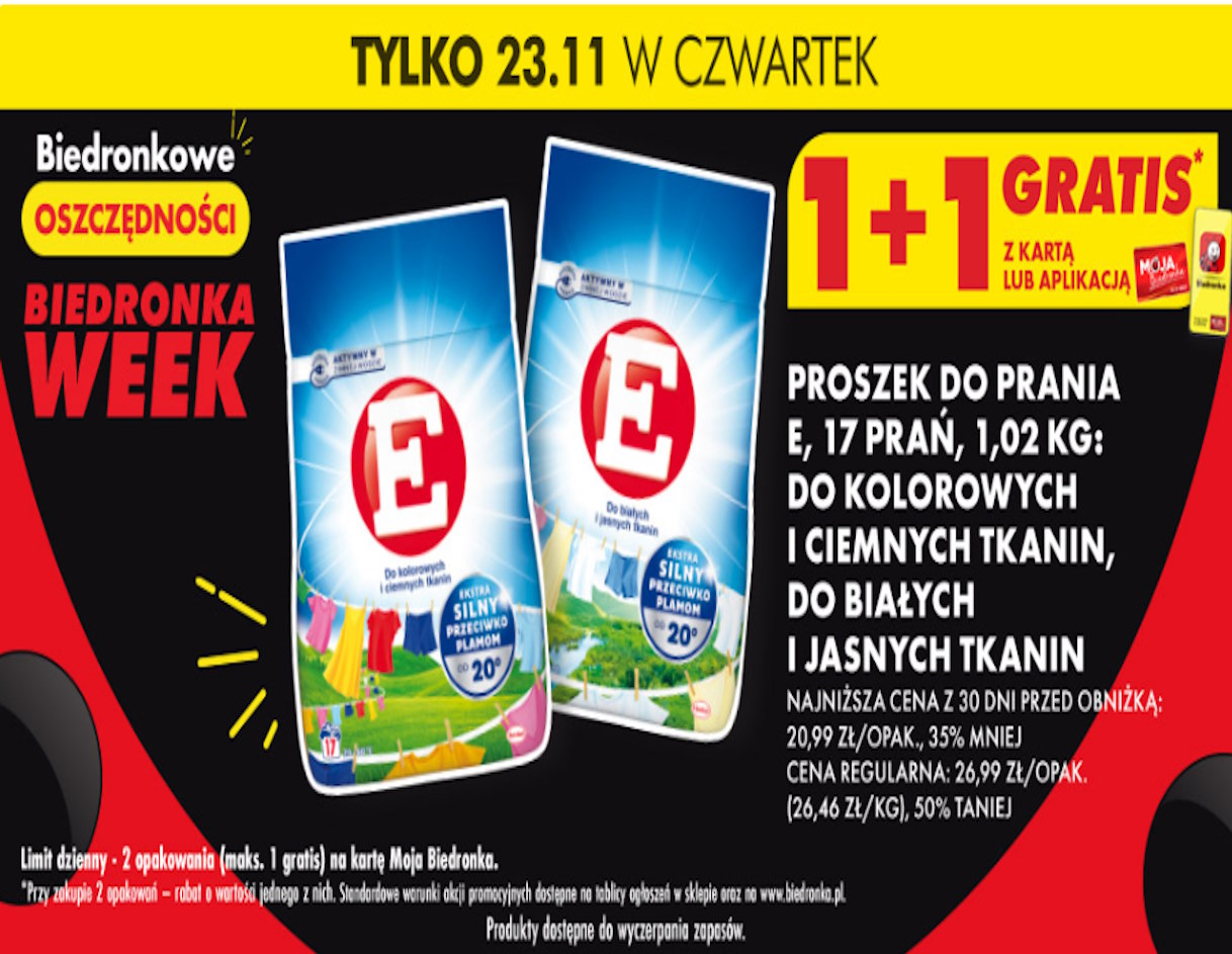 Biedronka wprowadza atrakcyjną promocję dla swoich klientów. Od jutra, przy zakupie proszku do prania E17, drugie opakowanie otrzymasz gratis. Promocja obowiązuje dla posiadaczy karty lub użytkowników aplikacji „Moja Biedronka” i dotyczy proszków do prania o pojemności 1,02 kg, zarówno do kolorowych i ciemnych, jak i do białych i jasnych tkanin.