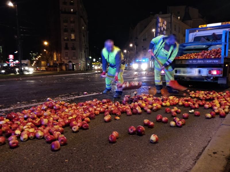 Służby są już na miejscu i uprzątają jabłka próbując udrożnić przejazd.