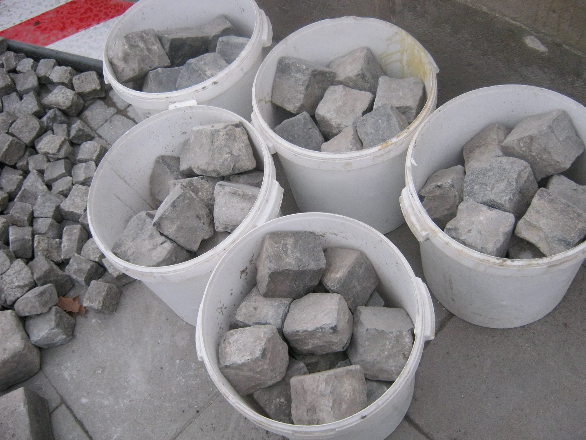 Prowokacja? Przypadek? Kostka brukowa w wiadrach na trasie Marszu Niepodległości