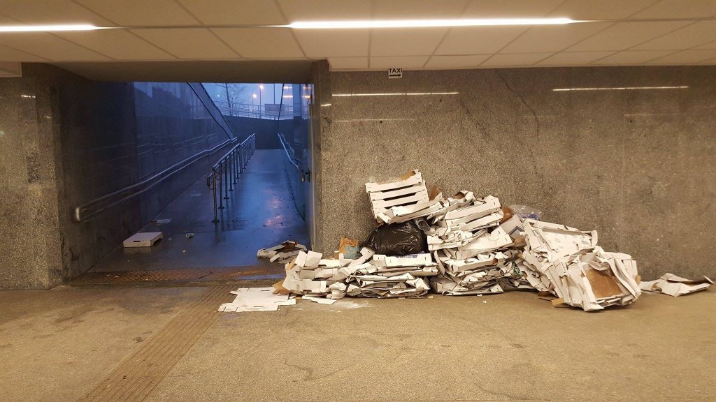 Na wyremontowanym Dworcu Zachodnim ktoś po Tłustym Czwartku pozostawił po sobie niemiłą, śmieciową pamiątkę. Pudełka po pączkach walają się na korytarzu.
