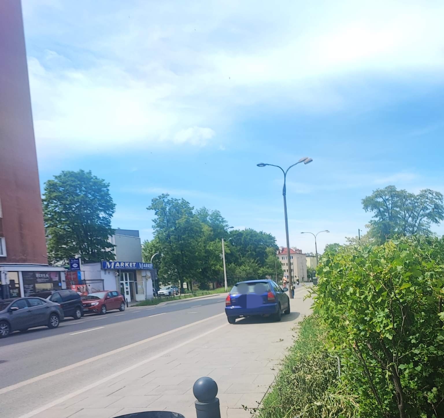 Widoczny na zdjęciu samochód przeciął ścieżkę rowerową i zaparkował na chodniku zajmując większą jego część.