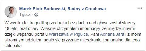 Rok temu doszło do ogromnej tragedii na Kamionku w której to zostało zamordowane 8-letnie dziecko, a jego 18-letni wówczas brat został bez dachu nad głową. Dzięki wspólnej interwencji Warszawy w Pigułce oraz radnych Marka Borkowskiego i Adriany Jary, udało się pozyskać mieszkanie dla 19-latka.