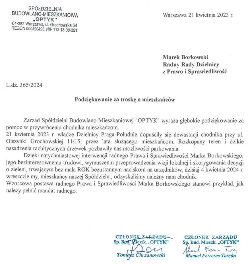 Ubiegłym roku w kwietniu otrzymałem wiele telefonów oburzonych mieszkańców Gocławka że na ul Olszynki Grochowskiej tuż obok piekarni pizzerii punktów usługowych gdzie od lat można było przystanąć zrobić zakupy czy też zaparkować na dłużej samochód nagle pojawił się trawniczek. Oczywiście o ten trawniczek nikt nie prosił nigdy nie potrzebował nie był ani uzgadniany z spółdzielnią mieszkaniową która tuż obok posiada nieruchomość ani z prowadzącym tam biznesy przedsiębiorcami. Nie poinformowano o jego powstaniu ani Rady Osiedla Grochów Północny, ani Radnych Dzielnicy.” – mówi radny Marek Borkowski w rozmowie z Warszawą w Pigułce.