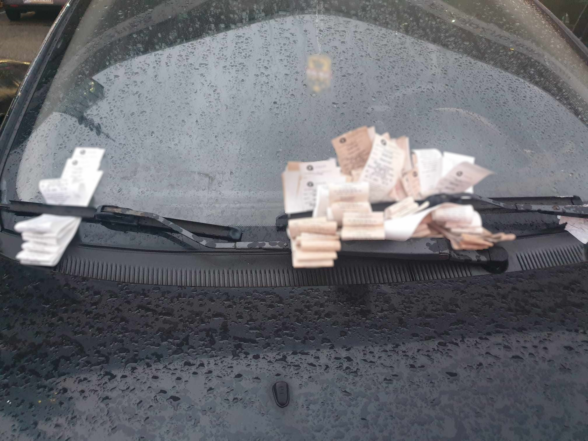 Najprawdopodobniej podróżny zostawił samochód na naprawdę długi czas, bo auto za przednią szybą ma mnóstwo mandatów.