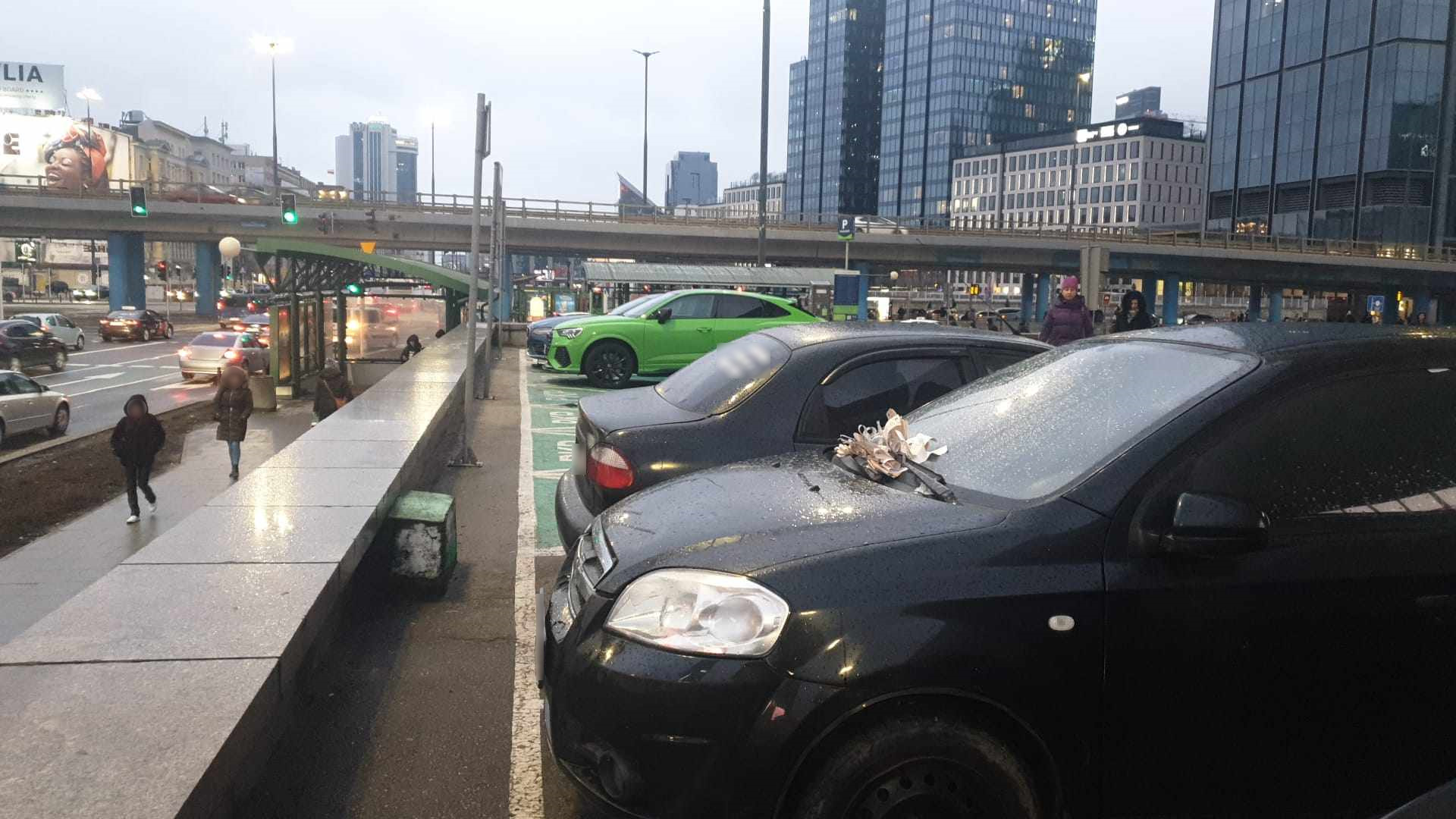Pod dworcem centralnym stoi chevrolet oblepiony mandatami. Parking jest płatny. Jeżeli nie wykupi się postoju, dostanie się mandat.