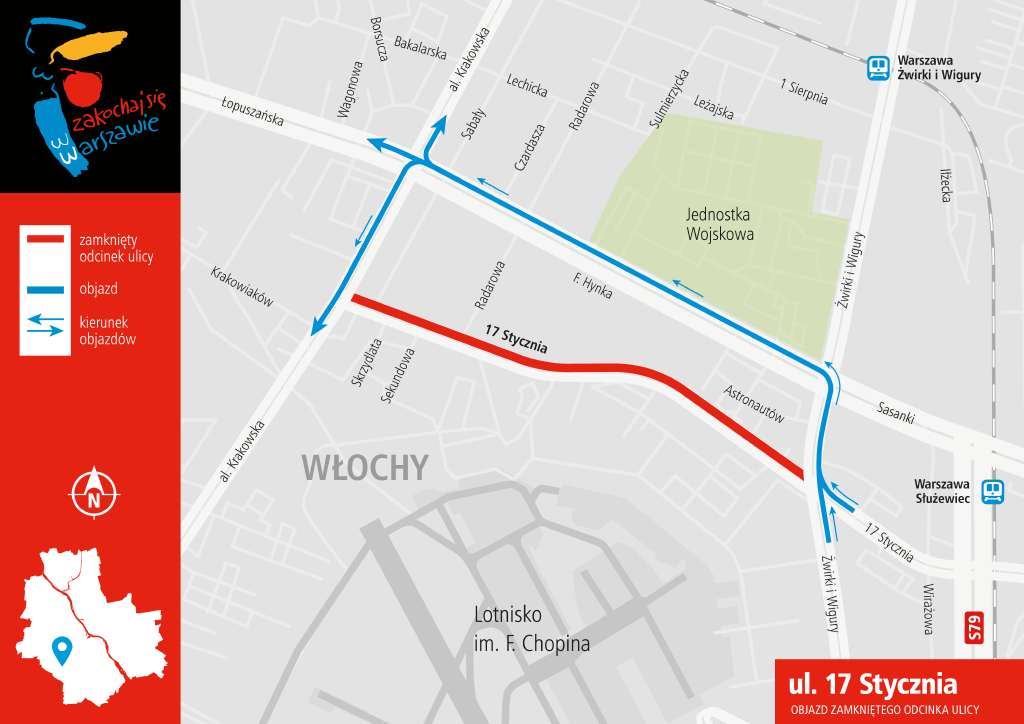 Na czas prac remontowany odcinek drogi będzie zamknięty dla ruchu. Objazdy poprowadzono ulicami: : Żwirki i Wigury – F. Hynka – al. Krakowska. W czasie prowadzonych prac połączenia z ul. 17 Stycznia nie będą miały ulice: Szybowcowa, K. Zarankiewicza, Radarowa i Sabały. Ruch na jezdni południowej będzie odbywał się bez utrudnień, przy czym wyjazd z ulic poprzecznych i budynków PLL LOT będzie możliwy tylko w stronę ul. Żwirki i Wigury.