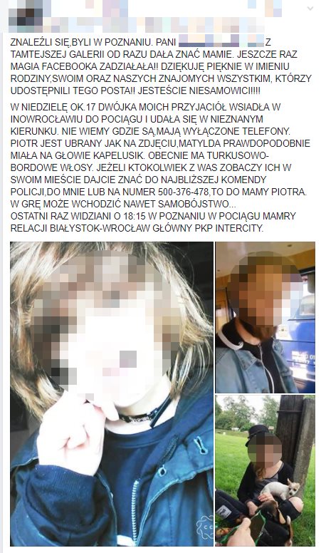 „Chciałbym podziękować Panu Łukaszowi za zainteresowanie sprawą zaginięcia dwojga młodych ludzi. Dzięki portalom społecznościowym odnaleziono ich zanim było za późno.Przepraszam jednocześnie, Że nie dokończyliśmy żadnej rozmowy,po prostu w tym chaosie bardzo często rozmawiałem na dwa telefony nie zapisując numerów. Dziękuję” – napisał Pan Paweł w liście skierowanym do Michała, naszego redaktora naczelnego.