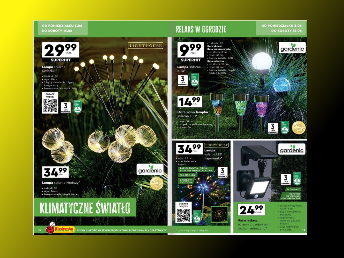 Od poniedziałku, 3 czerwca, Biedronka wprowadza wyjątkową ofertę na akcesoria oświetleniowe, które pozwolą zamienić każdy balkon czy ogród w magiczną oazę relaksu. Dzięki klimatycznemu oświetleniu, dostępnym w rewelacyjnych cenach, możesz stworzyć niepowtarzalną atmosferę na swoim balkonie, tarasie czy w ogrodzie.