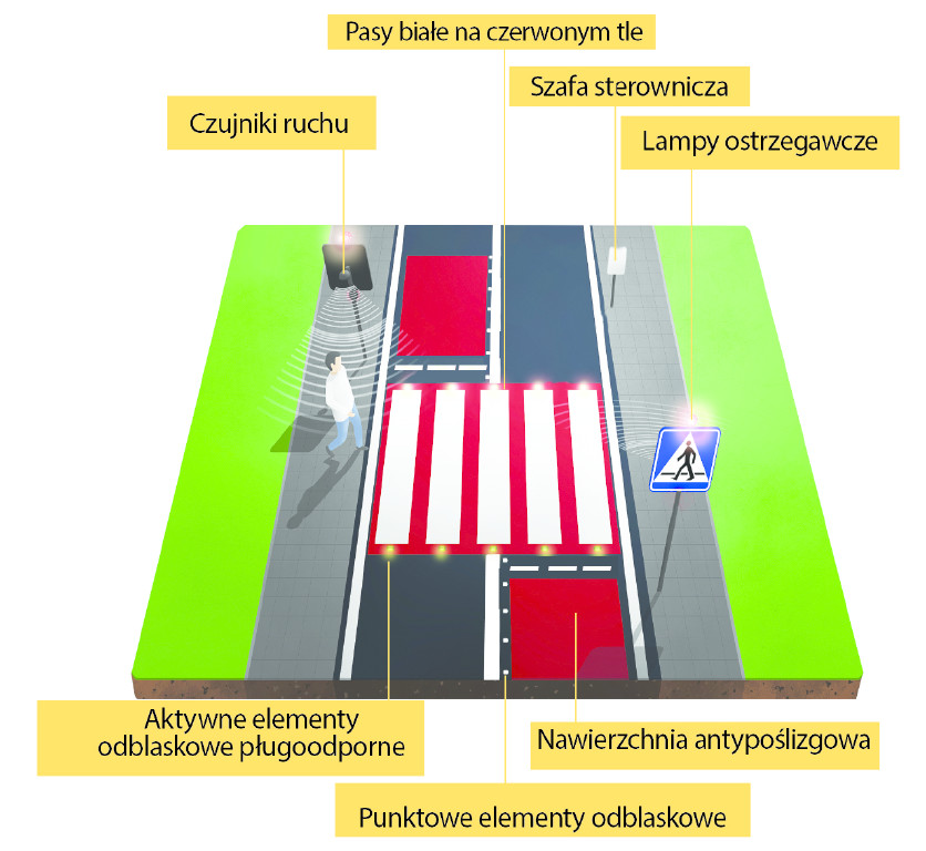 Jest to możliwe dzięki zastosowaniu specjalnego systemu identyfikacji, złożonego z kilku, zsynchronizowanych ze sobą elementów – czujników ruchu, punktowych elementów odblaskowych, biało-czerwonych pasów, znaków drogowych D-6 z lampami LED i nawierzchni antypoślizgowej.