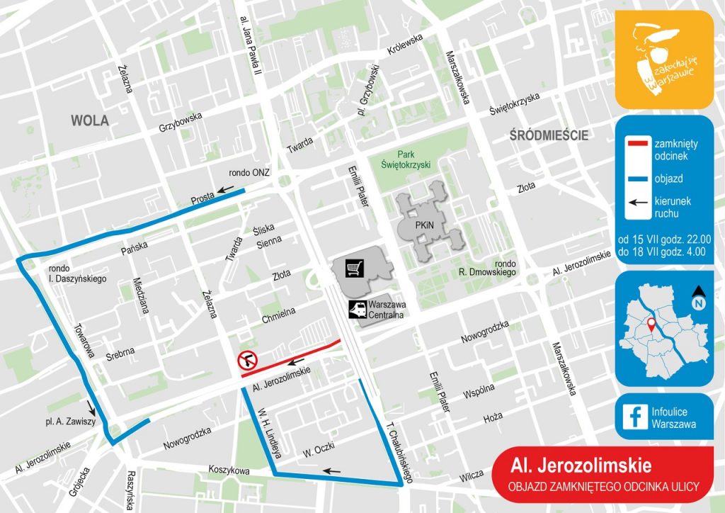 Zalecane objazdy będą prowadziły al. Jana Pawła II, do ul. Prostej i Towarowej lub ul. Chałubińskiego do Koszykowej i Lindleya.