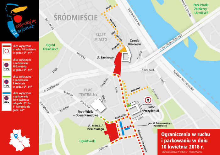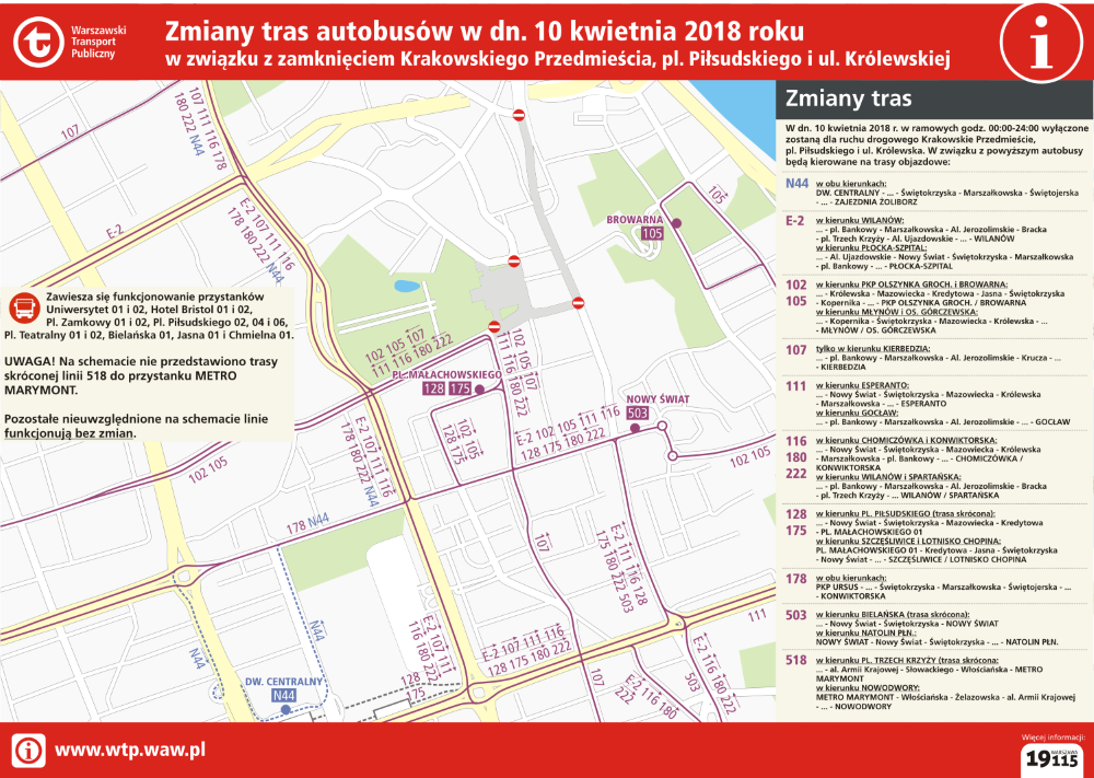 Ponadto, wymienione ulice będą wyłączone z ruchu kołowego i obowiązywał będzie na nich zakaz zatrzymywania się (znak B-36) wraz z tabliczką informującą o możliwości wywiezienia pojazdu na koszt właściciela (tablica T-24). Dodatkowo, całkowicie zamknięte dla ruchu będą ul. Miodowa od ul. Koziej do ul. Krakowskie Przedmieście oraz ul. Krakowskie Przedmieście od ul. Królewskiej do ul. Świętokrzyskiej.