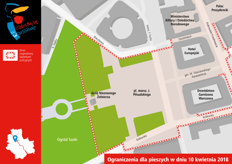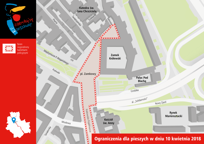 Całkowicie zostanie zamknięte przejście dla pieszych przez pl. Zamkowy wzdłuż Zamku Królewskiego, ul. Krakowskie Przedmieście (po obydwu stronach jezdni) pomiędzy Skwerem H.C. Hoovera a ul. Karową, a także ulicami Ossolińskich, gen. M. Tokarzewskiego-Karaszewicza i Królewską (po południowej stronie pomiędzy pl. S. Małachowskiego a Krakowskim Przedmieściem) oraz przez pl. marsz. J. Piłsudskiego.
