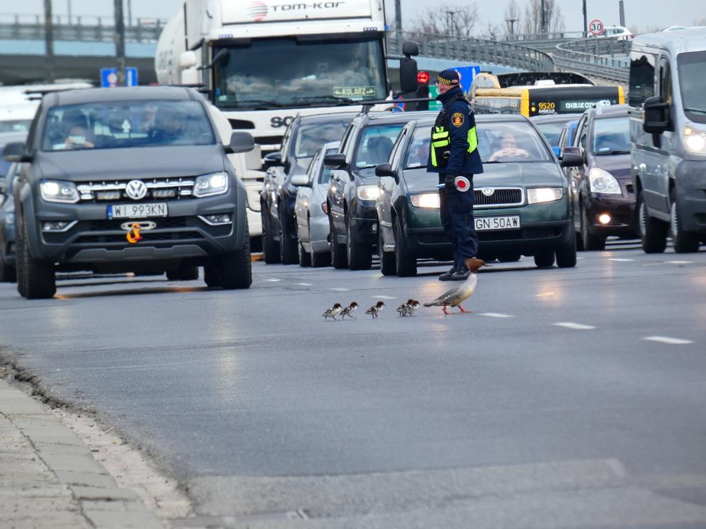 Dziś na chwilę służby musiały wstrzymać ruch, aby ta kacza rodzinka bezpiecznie przemierzyła drogę.