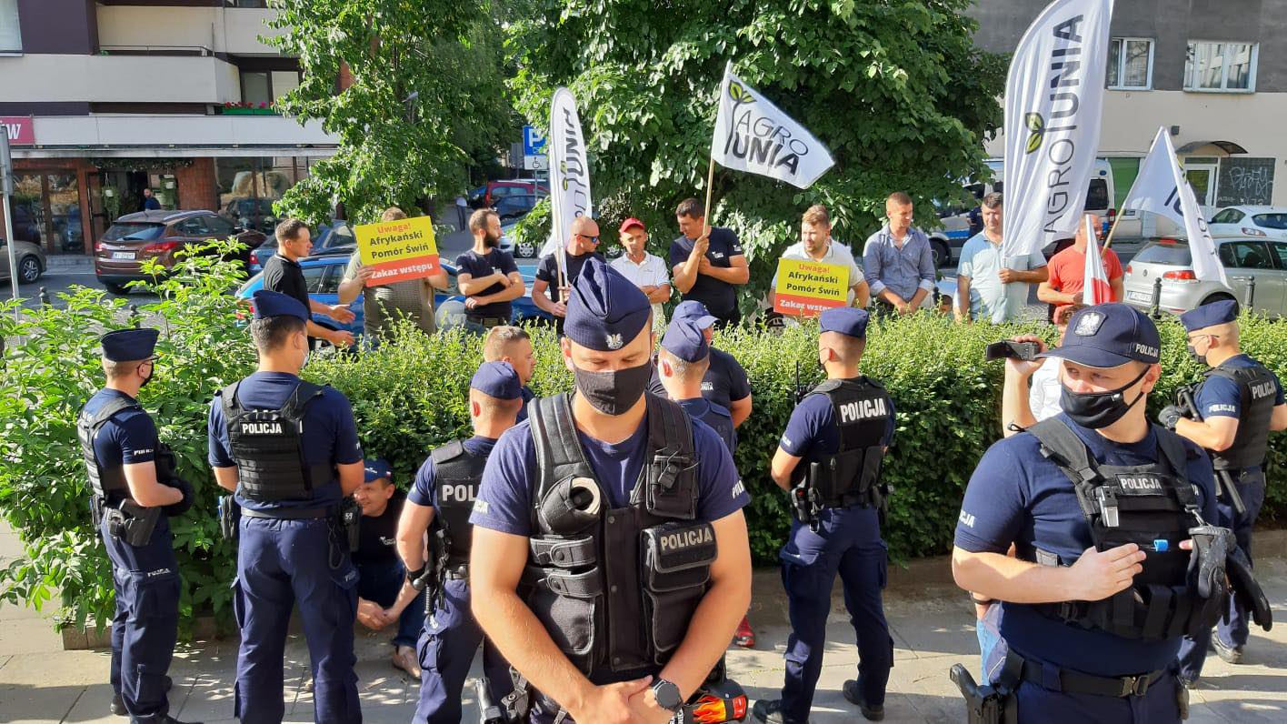„Uwaga, Ministerstwo Rolnictwa nie działa, AGROunia zamyka tę instytucję. Przez bezczynność pracowników tego gmachu – rolnicy – hodowcy trzody chlewnej nie mogą normalnie żyć, pracować i zarabiać” -było słychać z głośników.