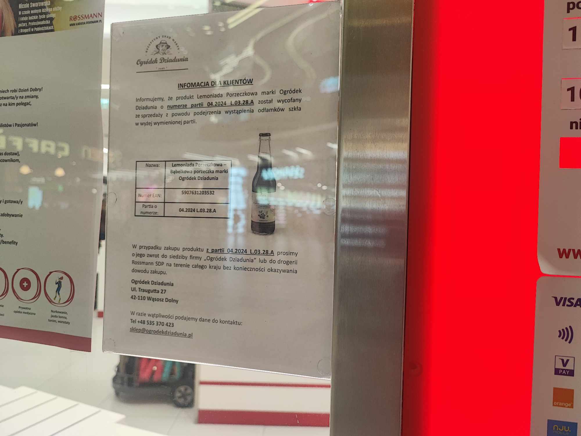 Jak informuje sieć drogerii Rossmann, produkt „Lemoniada pożyczkowa” marki „Ogródek Dziadunia” o numerze partii 04.2024L0328A został wycofany ze sprzedaży. Powodem jest podejrzenie wystąpienia odłamków szkła w napoju z wyżej wymienionej partii. Oznacza to potencjalne ryzyko dla zdrowia osób, które miałyby konsumować ten produkt.