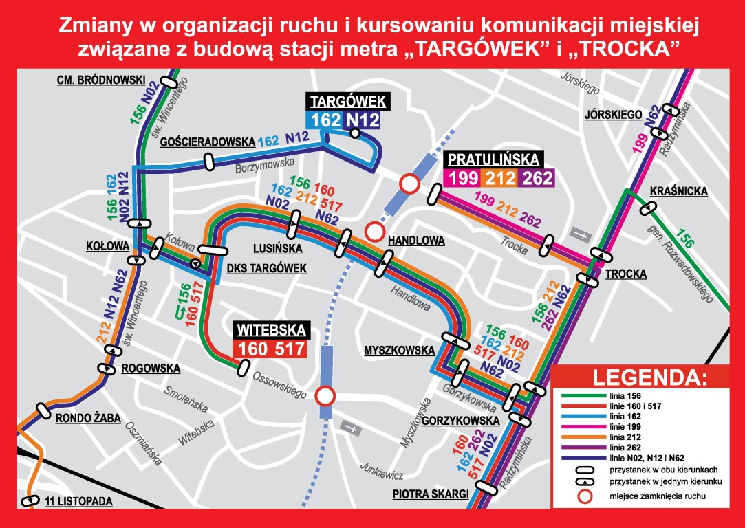 Na większe utrudnienia pasażerowie powinni się przygotować w związku z budową stacji Targówek oraz Trocka. W czasie prac zamknięty zostanie przejazd ulicą Ossowskiego w rejonie skrzyżowania z Pratulińską, Pratulińska pomiędzy Trocką a Handlową i skrzyżowanie z Trocką. Na trasy objazdowe zostaną skierowane linie autobusowe: 156, 160, 162, 199, 212, 517, N02, N12 i N62. Kursowanie 356 będzie zawieszone. Linia ekspresowa E-3 zostanie przekształcona 262, która będzie kursowała na nowej trasie we wszystkie dni tygodnia. Jej zadaniem będzie połączenie osiedli położonych przy ul. Trockiej z Dworcem Wileńskim w zamian za linie wycofane. Z myślą o mieszkańcach okolic obecnej pętli Targówek uruchomiony zostanie dodatkowy przystanek autobusowy na ul. Handlowej (w kierunku Gorzykowskiej) za skrzyżowaniem z Lusińską. Na ul. M. Ossowskiego, w rejonie przystanku Witebska, zostanie wybudowane rondo, które umożliwi zawracanie autobusom linii 156, 160 i 517. Przystanek Pratulińska stanie się zaś przystankiem końcowym dla linii: 199, 212, 262. W związku z tym, że ruch autobusowy będzie się odbywał głównie ul. Handlową oraz Gorzykowską, zostanie na nich – na odcinku od Kołowej do Święciańskiej (w jednym kierunku) – wytyczony buspas.