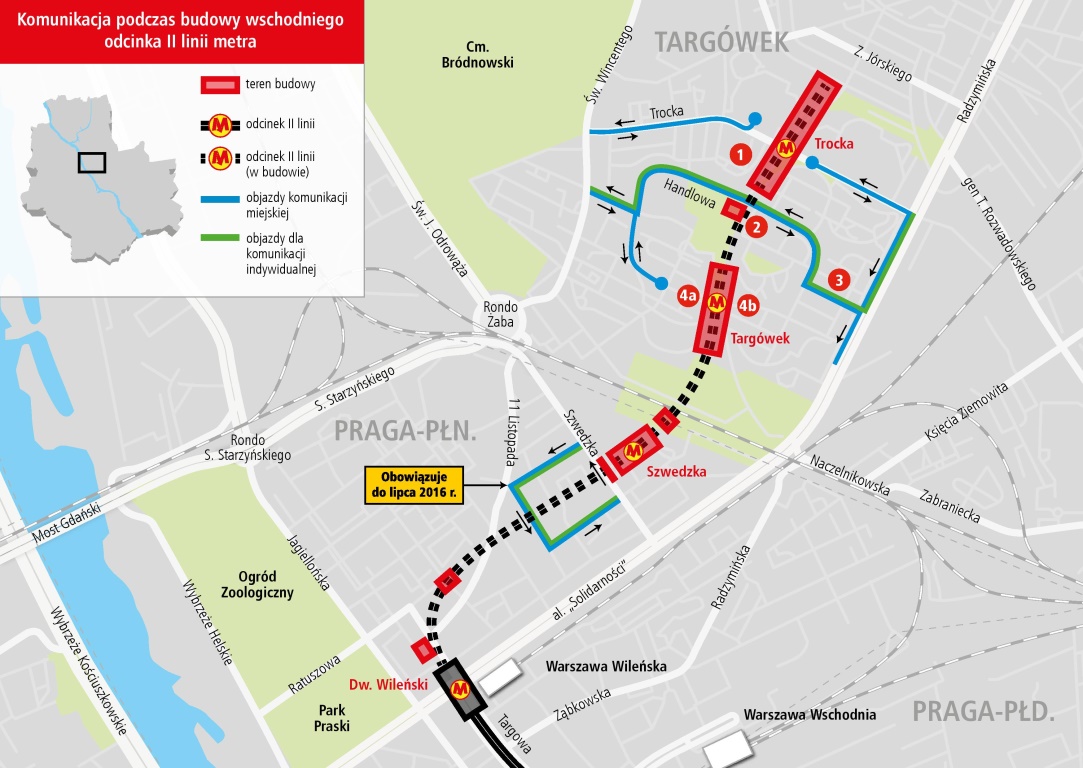 W długi weekend rusza rozbudowa II linii metra. Trasa wydłuży się o kolejne trzy stacje na Pradze-Północ i Targówku. Budowa po prawej stronie Wisły zakończy się 2019 roku. W związku z budową wystąpią utrudnienia w ruchu.
