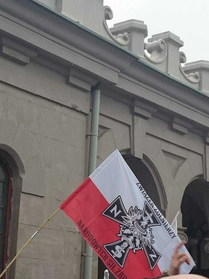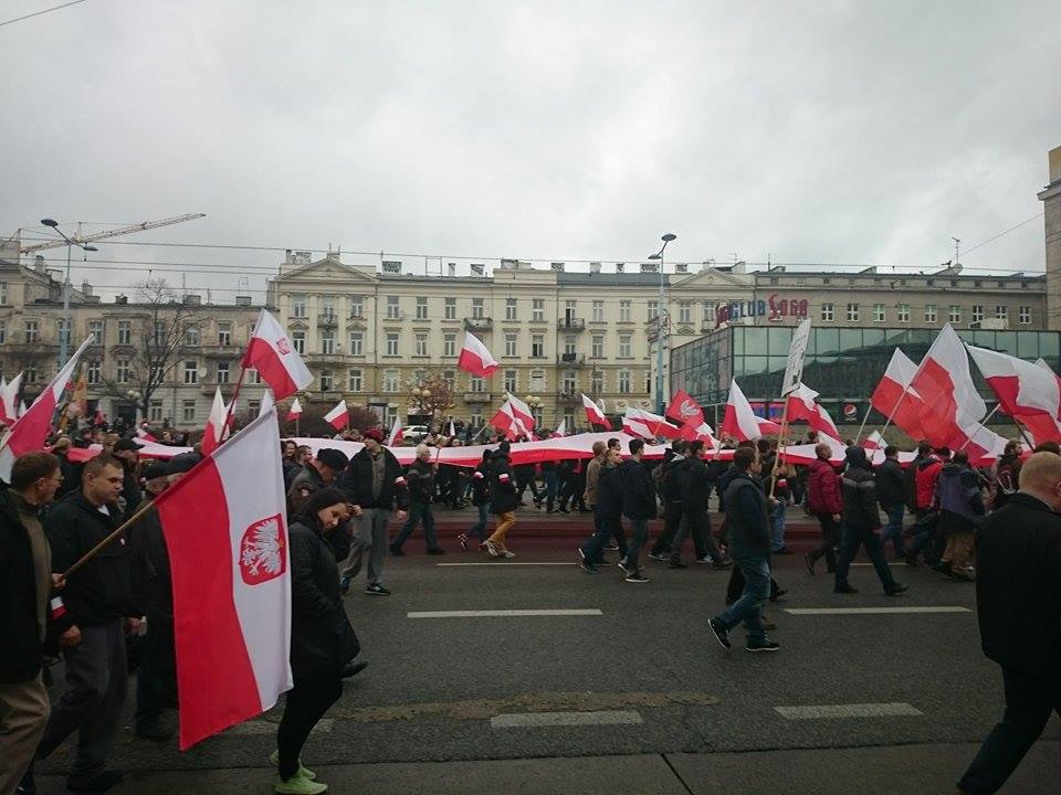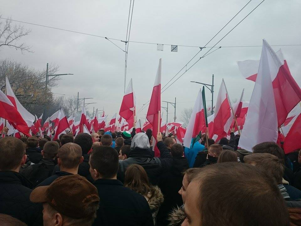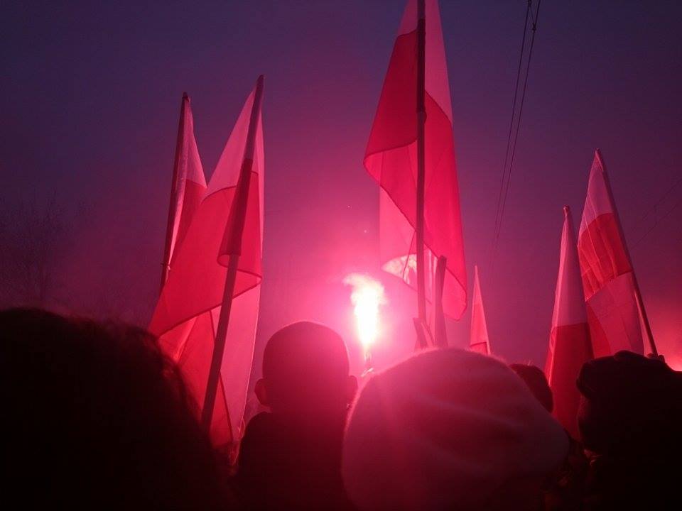 [14:30] Manifestanci skandują hasła, m.in.: „A na drzewach zamiast liści będą wisieć komuniści” i „Opamiętaj się rodaku – Polska tylko dla Polaków”.