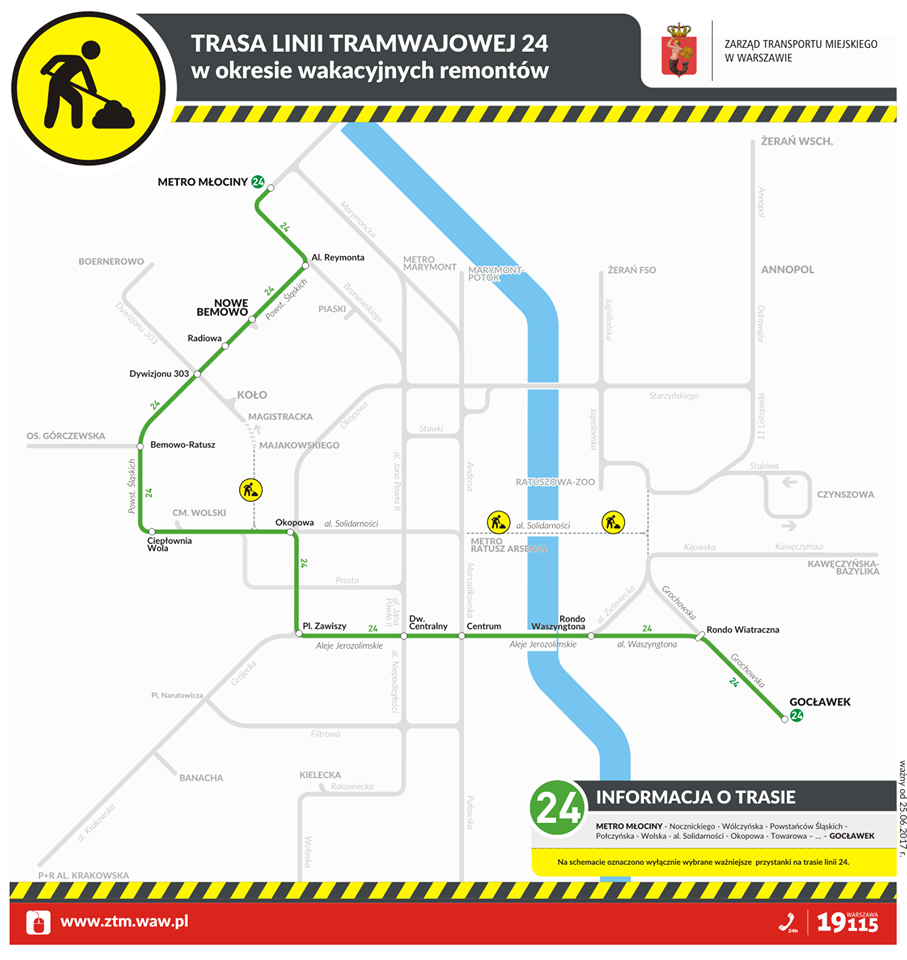 Od niedzieli, 25 czerwca w związku z zamknięciem ulicy Obozowej podczas remontu wiaduktu na kolejowej linii obwodowej, tramwaje linii 24 będą kursowały zmienioną trasą, w wydłużonej relacji do pętli Metro Młociny. Będzie to obecnie najdłuższa linia tramwajowa w Stolicy!