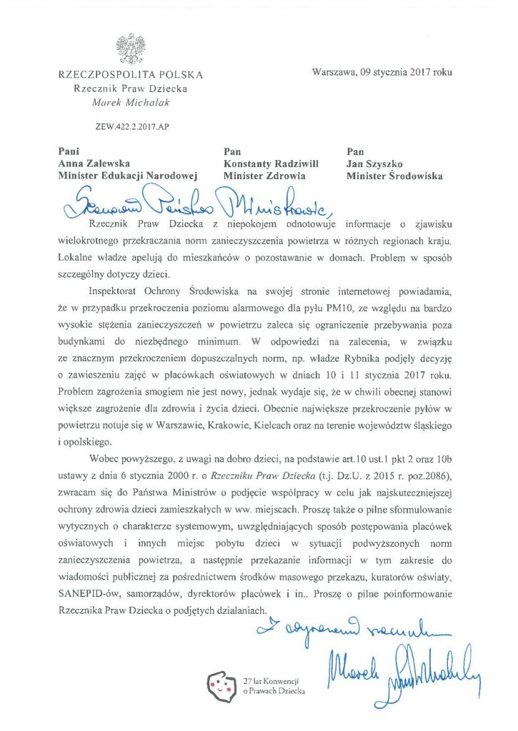 W związku z niepokojącymi informacjami o zjawisku wielokrotnego przekraczania norm zanieczyszczenia powietrza w różnych regionach kraju Rzecznik Praw Dziecka zaapelował do szefów trzech resortów: edukacji, zdrowia i środowiska, o sformułowanie wytycznych uwzględniających sposób postępowania placówek oświatowych i innych miejsc pobytu dzieci w takich sytuacjach.