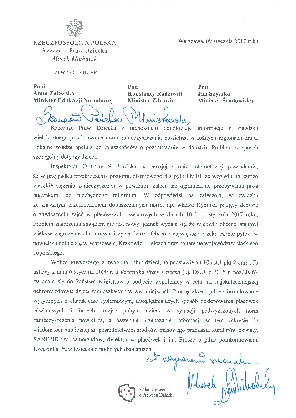 W związku z niepokojącymi informacjami o zjawisku wielokrotnego przekraczania norm zanieczyszczenia powietrza w różnych regionach kraju Rzecznik Praw Dziecka zaapelował do szefów trzech resortów: edukacji, zdrowia i środowiska, o sformułowanie wytycznych uwzględniających sposób postępowania placówek oświatowych i innych miejsc pobytu dzieci w takich sytuacjach.